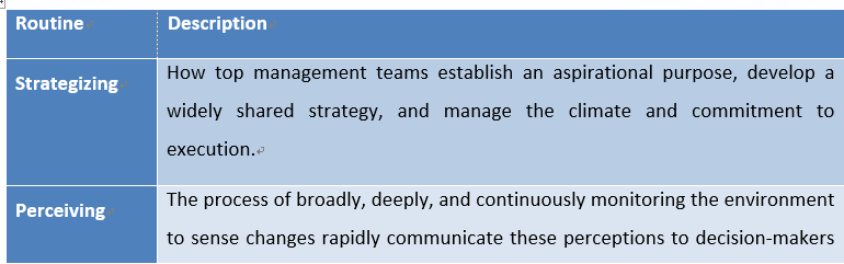 One of the routines is Strategizing. Top management teams control the organization's atmosphere and commitment to implementing organizational change and broadly shared short- and long-term strategies with a shared purpose. The next is perceiving routine. It explains how companies are intended to monitor the external environment and pass these perceptions to decision-makers for interpretation for making the right and agile decisions. The testing routine is about to continue trying while failing until succeed. People are encouraged to try new things, and keep learning from their failures to be prepared to achieve innovation in an agile manner. Finally, the implementation routine explains how the organization keeps its capability to change by implementing the organizational changes supported by leadership and human resource management systems.